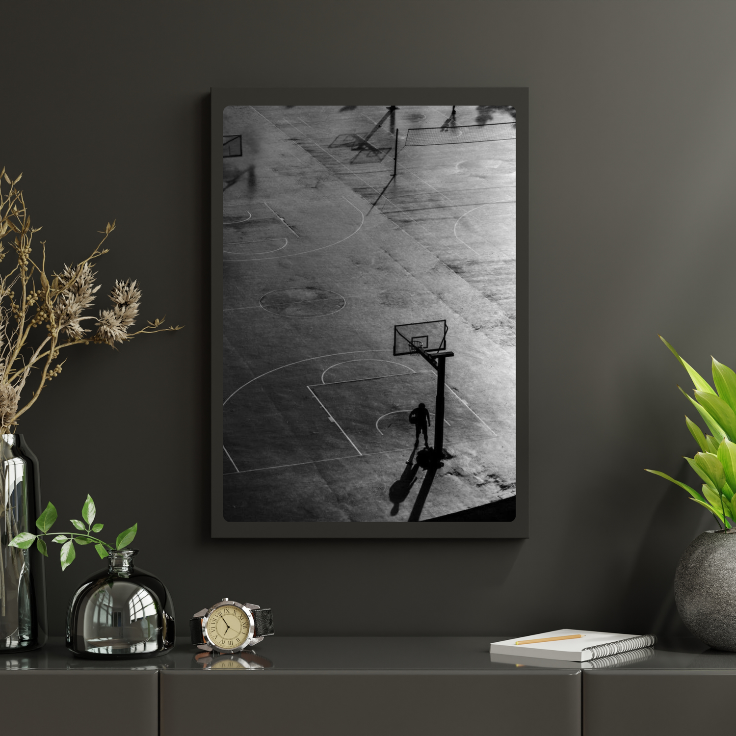 En intégrant cette affiche dans votre intérieur, vous créez un espace inspirant où chaque regard posé sur le terrain devient un rappel de vos objectifs, de votre discipline et de votre envie de vous améliorer chaque jour. Le contraste noir et blanc apporte une touche moderne et intemporelle, tout en mettant en valeur la puissance graphique du basketball.